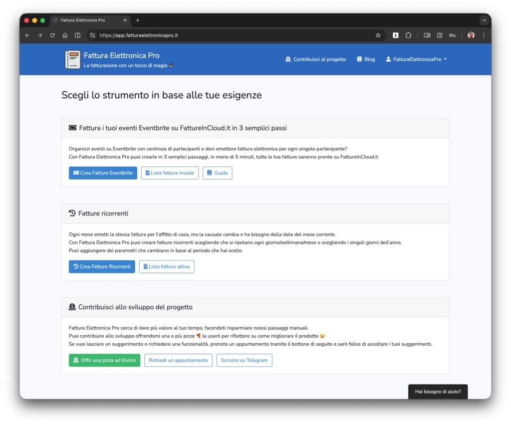 Fattura Elettronica Pro was a small software project created to solve a very practical problem: reducing repetitive manual work for people using Fatture In Cloud, especially when they needed to create many electronic invoices from external sources such as Eventbrite.